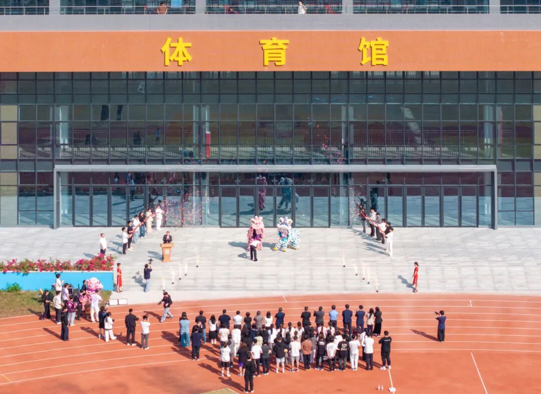 随后,翁礼成宣布,江门校区体育馆正式启动!现场彩炮齐鸣,舞狮腾跃,鼓乐喧天,师生掌声雷动,“体育馆”大字缓缓揭下红绸,金色字体在阳光下熠熠生辉,这一刻,标志着校园文体设施建设迈入新阶段。