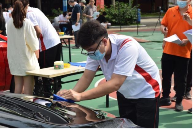为提升技术技能人才培养质量,促进课赛融合及产教融合,探索符合汽车行业的人才培养模式,挖掘和培养汽车文化与汽车技术的优秀人才,智能工程学院主动对接合作企业,邀请校企合作单位进校园,与广州市标榜汽车用品实业有限公司举办“标榜杯”汽车技能大赛。赛场上,选手们都以饱满的热情和最佳竞技状态全身心投入比赛中,先后对车身进行研磨、上蜡、抛光、完饰,以精湛娴熟的动作及专注的精神完成一系列操作流程。