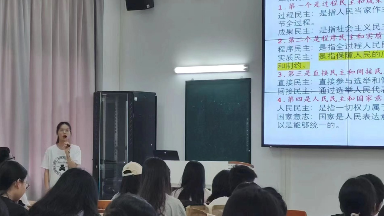 本堂展示课由师生共同完成的。课堂上,柳中东教授与23级学前教育3班的许晓漫同学共同展示了“同位教学”模式的精髓。本节授课内容为《习近平新时代中国特色社会主义思想概论》第八章第二节“全过程人民民主是社会主义民主政治的本质属性”。在教学中,许晓漫同学展现了她对本节课学习内容的深入理解。她首先与同学分享了自己的见解,通过具体的实例进行列举,引发了同学们的思考和讨论。她的整个表达过程思路清晰,用语精炼,有效地促进了课堂互动和学习效果的提升。