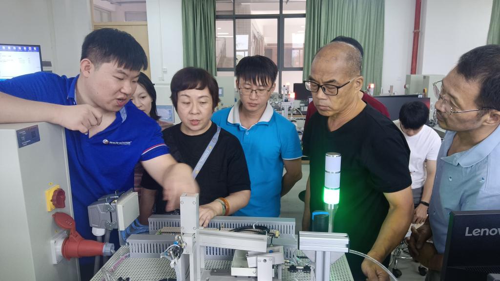 高会泽培训师围绕集电气控制技术、气动控制技术、传感器技术、变频控制调节技术、步进控制技术,从控制工艺设计、产品检测、质量控制、生产过程可视化、上位监控软件等开展培训。培训中教师们踊跃发言,高会泽培训师对教师们提出的问题做了细致解答。高会泽培训师理论知识与实践相结合,提升教师实际操作能力,通过不断地发现问题、解决问题和总结经验,教师实操能力稳步提高,充分感受到自动化专业领域的广阔。