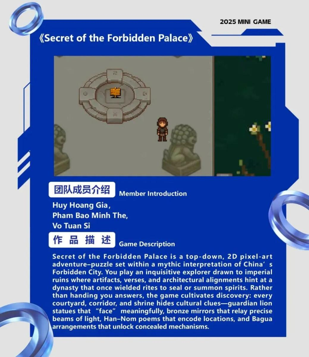 越南雒鸿大学参赛团队表现出极高的参与热情和出色的跨文化创意能力,凭借作品《Secret of the Forbidden Palace》荣获“特别奖”。该作品以中国传统紫禁城为背景,融合石狮、青铜镜、汉字诗词和八卦机关等文化元素,展现出越南青年对中国文化的深刻理解与创新表达能力。