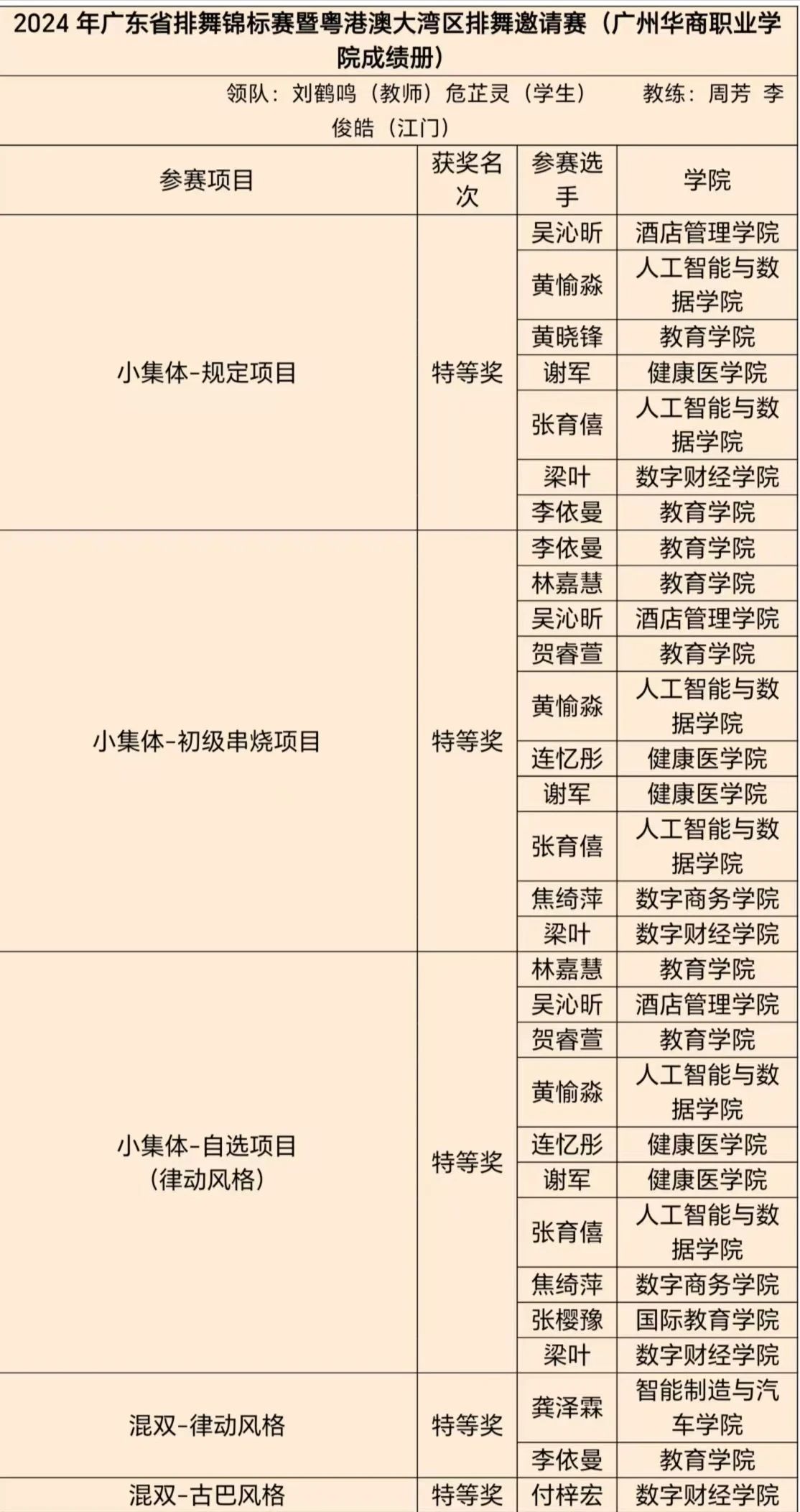 在2024年广东省排舞锦标赛和广东省大学生网球锦标赛中,我校选手以卓越的表现和精湛的技艺,分别夺得排舞团体第一名和网球男子双打冠军,展现了我校学子的竞技实力和精神风貌!