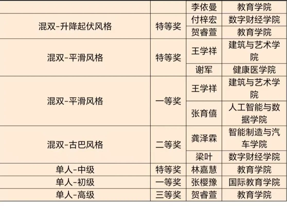 本次大赛共有来自全省1000多名运动员参加。我校15名选手参加了单人初级,中级,高级;男女双人恰恰,桑巴,华尔兹,西海岸;规定项目街舞集体舞,自选项目集体舞,串烧项目集体舞共10个项目。