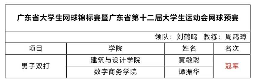 11月10日至16日,在广东省教育厅主办的2024年广东省大学生网球锦标赛暨广东省第十二届大学生运动会网球预赛中,我校黄敏聪和谭振华两位运动员在丙组男子双打比赛中,面对恶劣天气和紧凑赛程的双重挑战,展现出非凡的竞技状态和顽强斗志,最终勇夺冠军,团队获得团体二等奖。