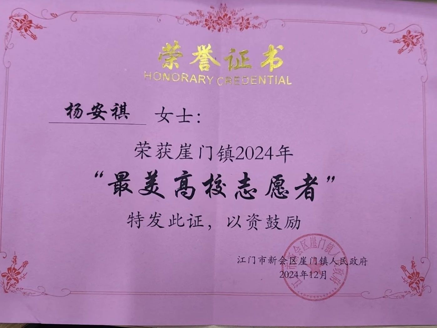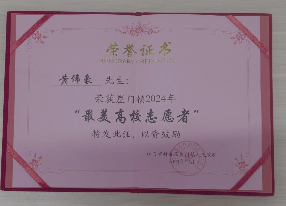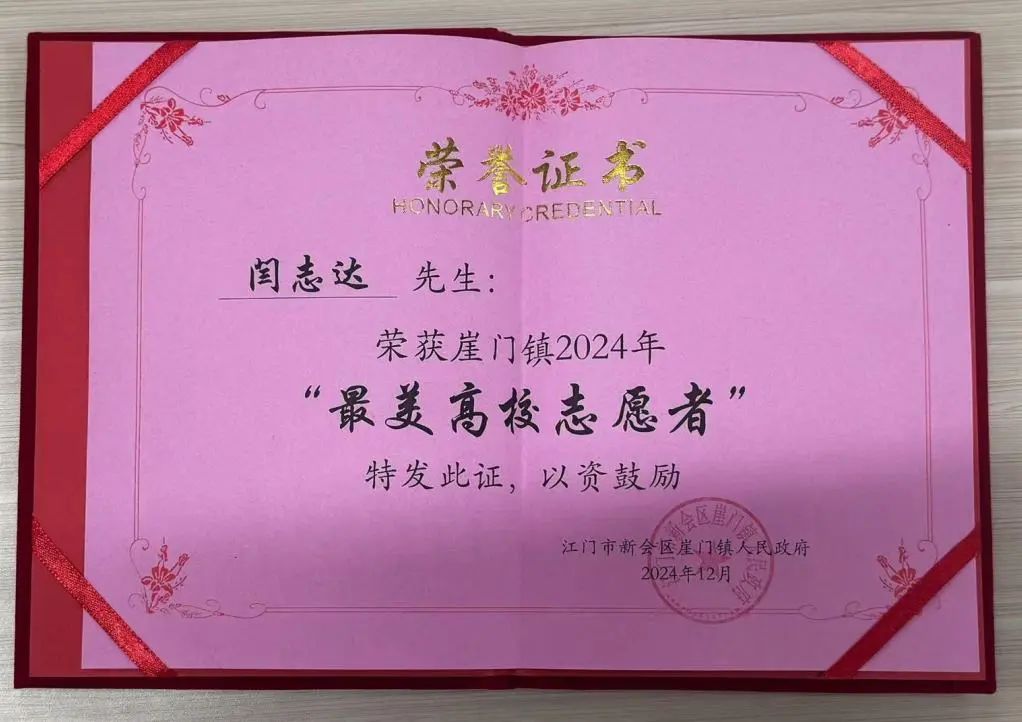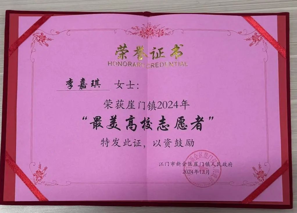 同时,我校师生闫志达,杨安祺,李嘉琪、黄伟豪,因在崖门志愿服务中表现卓越,受崖门镇政府颁发“最美高校志愿者”称号。这些荣誉不仅是对个人与学校参与志愿服务的高度认可,更是激励全体师生继续投身公益、践行社会责任的强大动力。