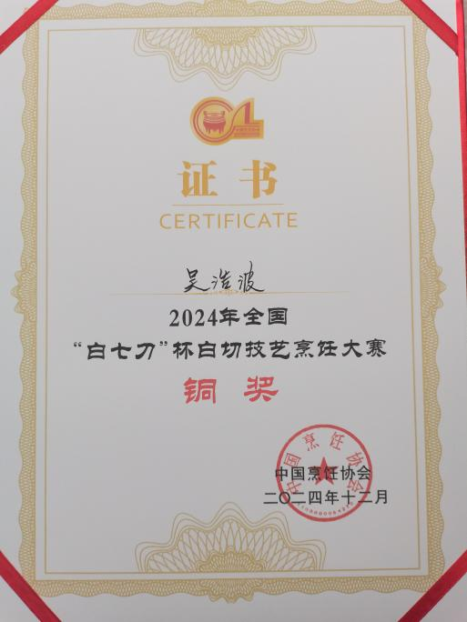 12月12日,2024年全国“白七刀”杯白切技艺烹饪大赛暨博白农产品展销会在广西隆重举行。2025新澳门免费原料网附属教学酒店·太阳城大酒店吴浩波老师凭借精湛的烹饪技艺,在众多参赛选手中脱颖而出,荣获铜奖。