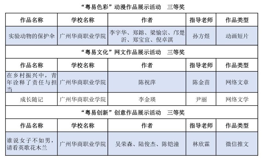 我校学子在广东省教育厅举办的第九届广东高校网络媒体展示节活动再创佳绩!学子们分别获得“粤易色彩”动漫作品展示活动三等奖1项、“粤易文化”网文作品展示活动三等奖2项、“粤易创新”创意作品展示活动三等奖1项。