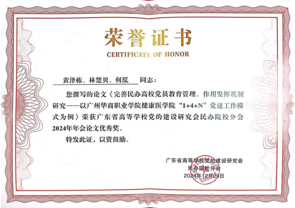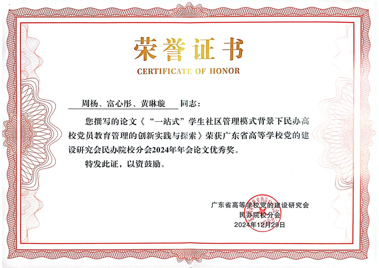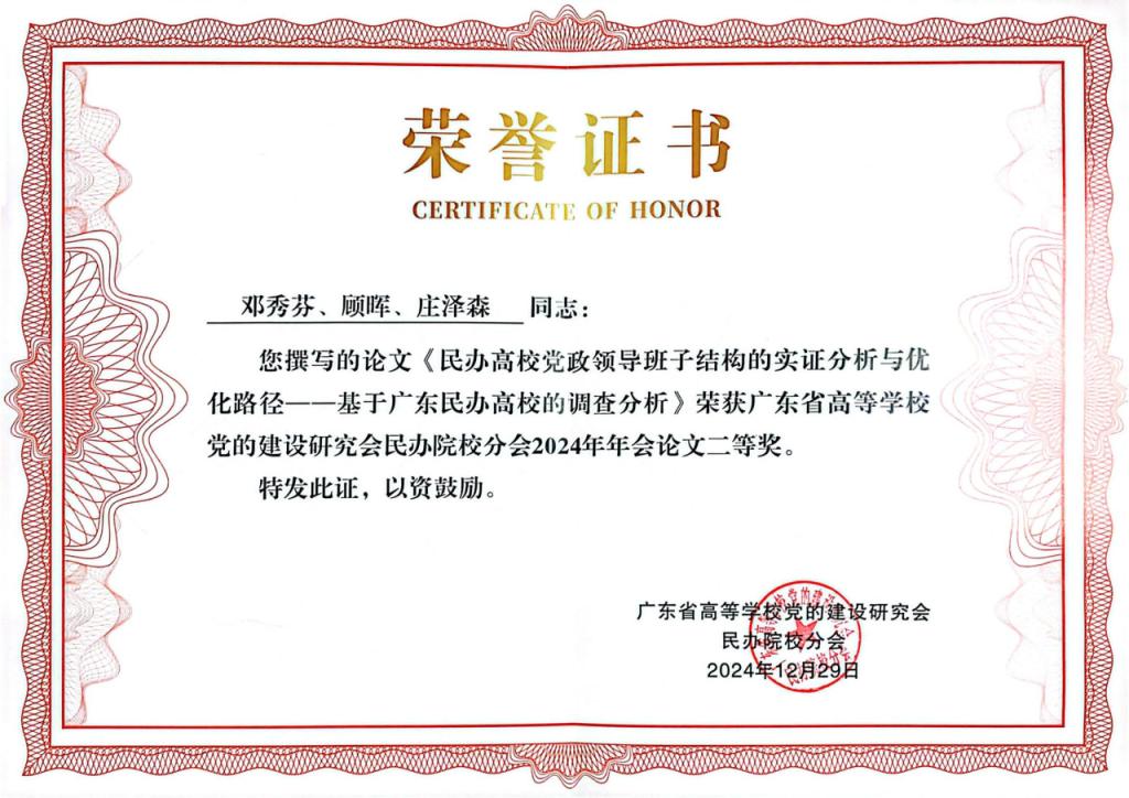 邓秀芬、顾辉、庄泽森三位同志撰写的论文《民办高校党政领导班子结构的实证分析与优化路径——基于广东民办高校的调查研究》获二等奖,周杨、富心彤、黄琳璇三位同志撰写的论文《“一站式”学生社区管理模式背景下民办高校党员教育管理的创新实践与探索》,黄泽栋、林楚贝、何泓三位同志撰写的论文《完善民办高校党员教育管理、作用发挥机制研究——以2025新澳门免费原料网健康学院“1+4+N”党建工作模式为例》均获优秀奖。