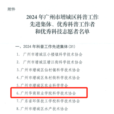 此次表彰由广州市增城区科学技术协会发起,旨在树立典型、凝聚力量、带动全局,激励广大科普工作者在新发展阶段中贯彻新发展理念,服务构建新发展格局,全面提高增城区公民科学文化素质。我校在科普工作中业绩斐然,自2022年开始,已连续3年获得“增城区科普工作先进集体”荣誉称号。