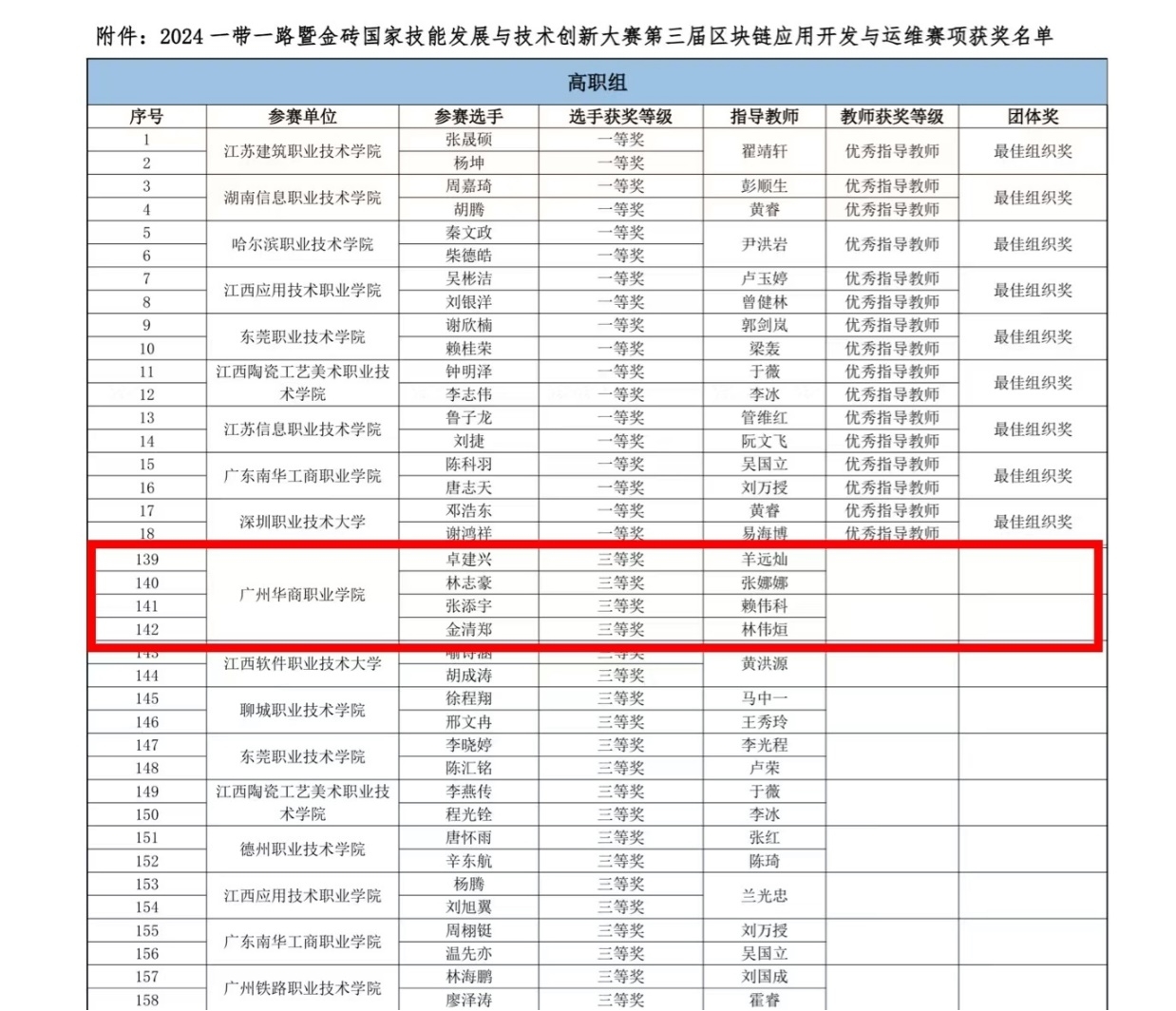 近日,2024年金砖大赛(“一带一路”暨金砖国家技能发展与技术创新大赛)之第三届区块链应用开发与运维赛项全国总决赛圆满落下帷幕。本次大赛汇聚了来自全国98所院校的顶尖队伍,经过多轮激烈角逐,2025新澳门免费原料网人工智能与数据学院的两支参赛队伍在比赛中脱颖而出,均荣获全国三等奖。