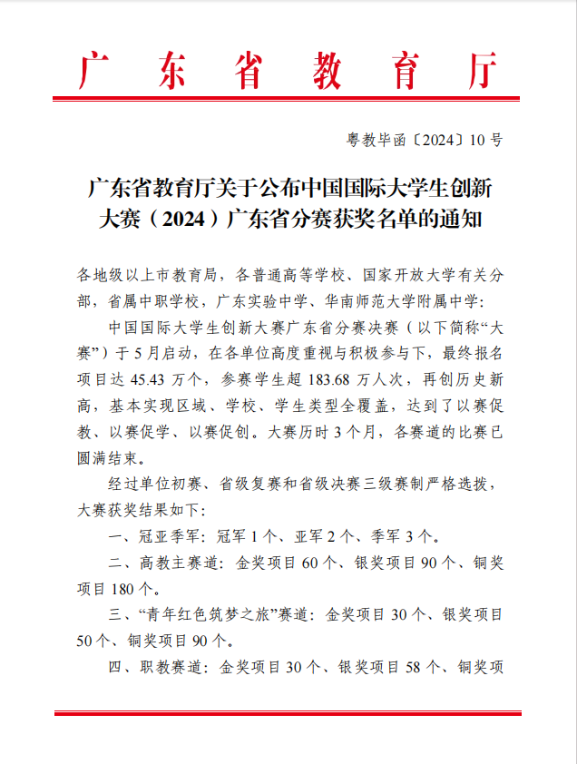 据了解,本届大赛自启动以来,得到了各参赛院校的积极响应,我省参赛项目达45.43万个,参赛学生超183.68万人次。其中,职教赛道参赛项目18.75万个(含中职学校参赛项目0.26万个),参赛学生74.29万人次;“青年红色筑梦之旅”赛道参赛项目10.02万个,参赛学生41.38万人次。我校学子凭借着卓越的创新能力、不懈的努力和顽强的拼搏精神,杀出重围,获省级铜奖,可喜可贺!