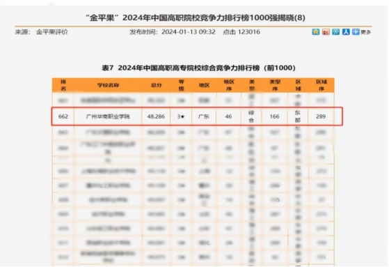 日前,“金平果”2024年中国高职院校综合竞争力排行榜正式发布,我校排名显著跃升,提升了81个名次。榜单显示,我校在全国的排名由2023年的743名上升到2024年的662名,在与广东公办高职院校的共同排名中,位居全省第46名。