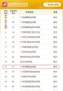 此外,在2024软科中国高职院校排名中,我校在中国民办高职类高校中,位居全国第71,广东第11,彰显了我校在职业教育领域的办学实力和卓越成就。