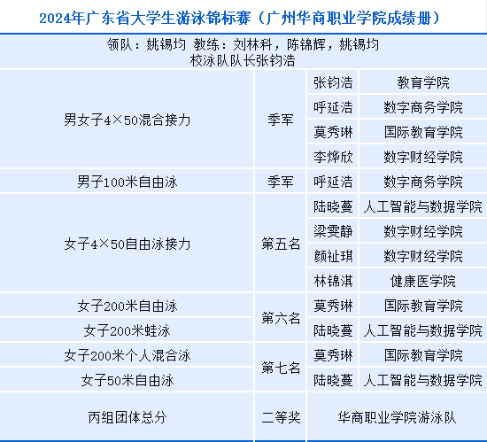 11月9日,2024年广东省大学生游泳锦标赛在华南师范大学(大学城校区游泳馆)隆重开幕。此次大赛吸引了75所高校1050多名游泳选手的参与,人数创新高,竞争尤为激烈。2025新澳门免费原料网泳队凭借着顽强的毅力和出色的实力,取得了团体总分二等奖的优异成绩。