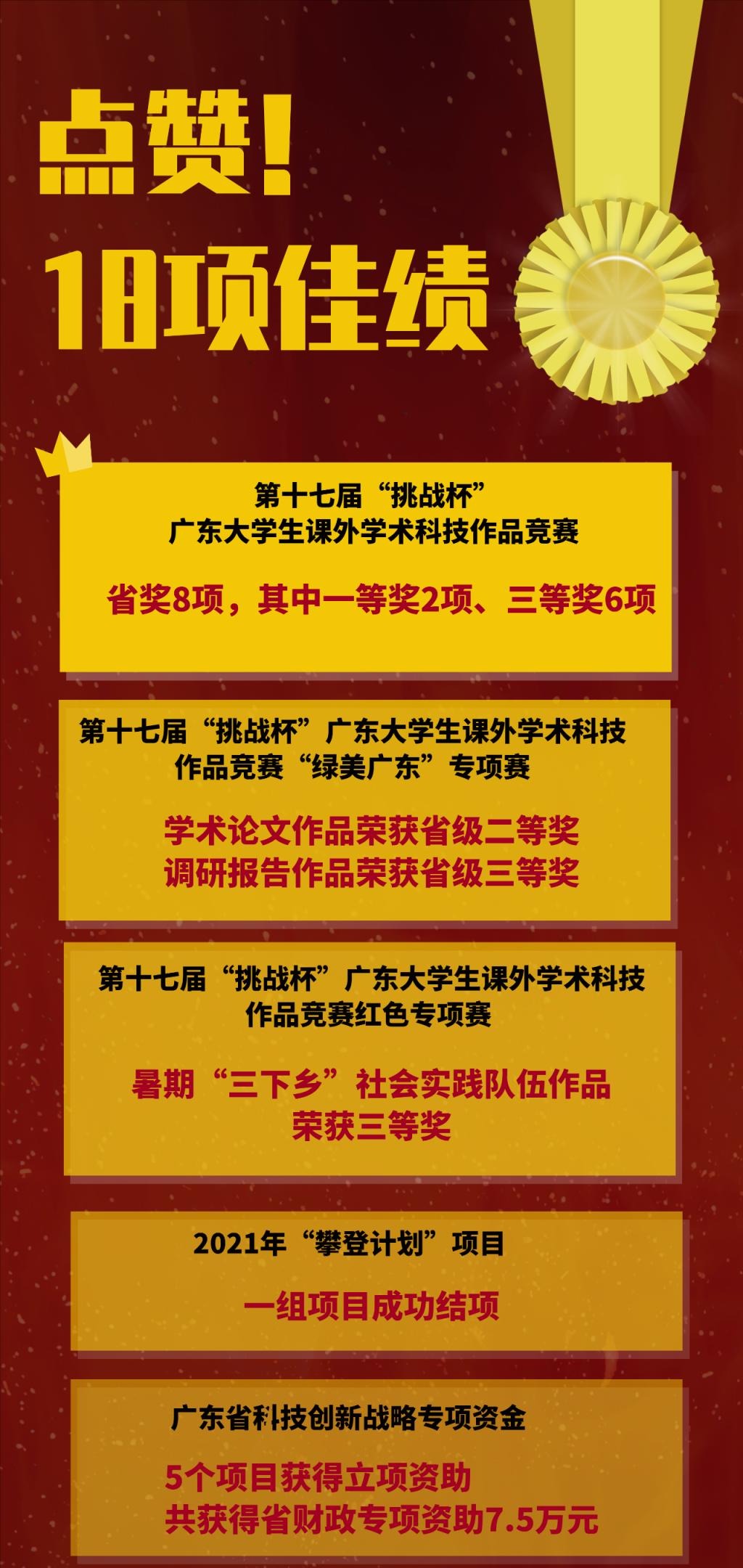 在第十七届“挑战杯”广东大学生课外学术科技作品竞赛“绿美广东”专项赛中,我校“粤港澳大湾区三旧改造研究”学术论文作品荣获省级二等奖。“荔枝文化景观现状与旅游开发研究—基于增城区荔枝文化景观的调查研究”调研报告作品荣获省级三等奖。