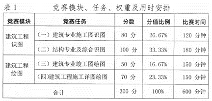 建筑工程识图赛项考核题目涵盖了对建筑施工图、结构施工图、建筑竣工图、图纸会审意见的识读、理解与绘制,比赛主要依据相关国家职业技能规范和标准,注重考核基本技能,体现标准程序,结合生产实际,考核职业综合能力。比赛内容以"1+X"建筑工程识图技能为基础,以实际工程施工图纸为载体,以实际岗位的工作过程为序列,以学生对应职业岗位要求为标准,以国家现行规范标准为依据来设计竞赛方式、竞赛模块和题目。参赛选手需在规定的时间内,独立与合作完成建筑工程识图、建筑工程绘图两个竞赛模块的任务(见表1)。