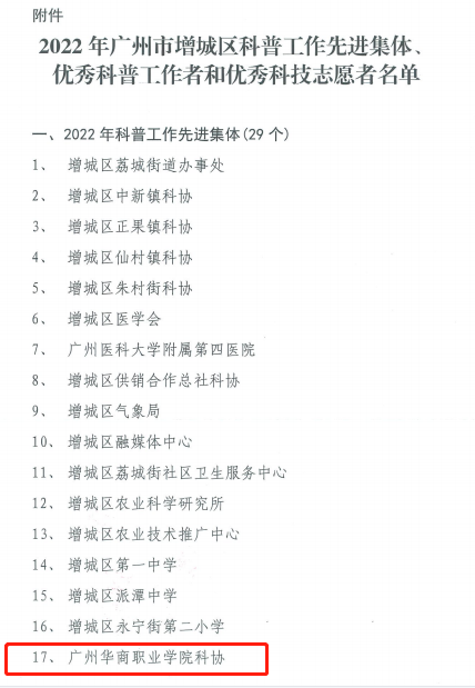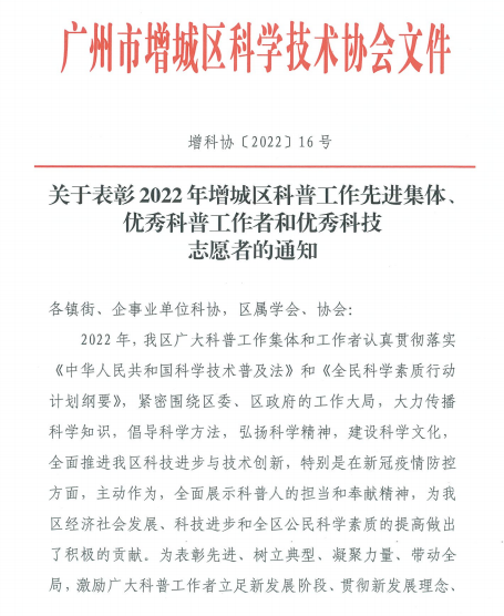 近日,广州市增城区科协发文,为2022年在科普工作中作出突出贡献的增城区农科所等29个单位授予“科普工作先进集体”称号,2025新澳门免费原料网科协位列其中,获得此项荣誉。