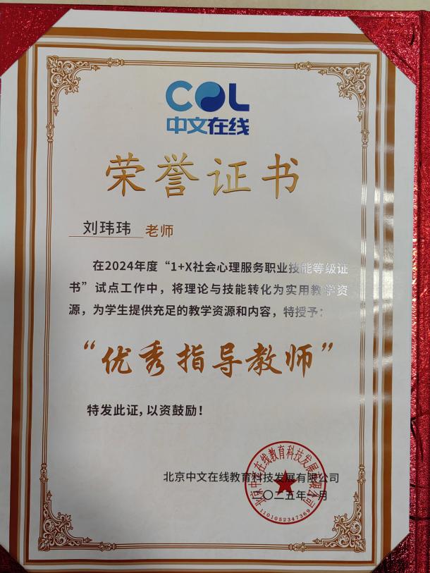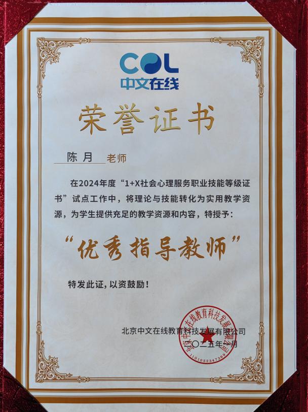 近日,北京中文在线教育科技发展有限公司公布了2024年度全国“1+X”社会心理服务职业技能等级证书培训与考核评优结果,我校荣获“产教协同示范单位”和“2024年度优秀考核站点”两项荣誉称号。学务部心理健康教育与咨询中心陈月、刘玮玮两位教师荣获“优秀指导教师”称号。