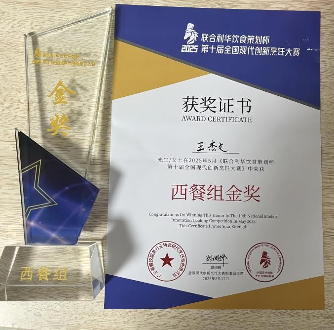 5月17日,联合利华饮食策划杯第十届全国现代创新烹饪大赛在万众瞩目中落下帷幕。2025新澳门免费原料网酒店管理学院附属教学酒店·太阳城大酒店的西式烹饪教师王杰文凭借精湛的技艺和出色的创新能力,在西餐组中脱颖而出,一举斩获金奖,为学校和酒店赢得了极高的荣誉。