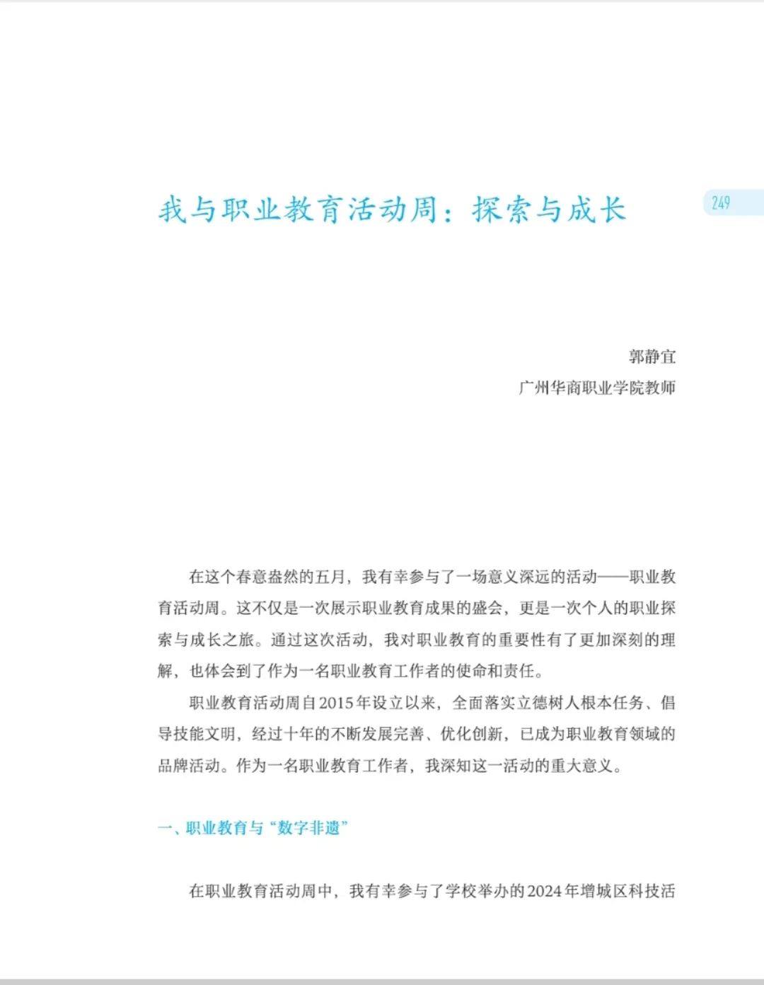 《我与职业教育活动周:探索与成长》这篇文章回顾了郭静宜老师参与职业教育活动周的丰富经历和深刻体会。在2024年增城区科技活动周“数字非遗”科普嘉年华暨科技文化艺术节中,郭静宜老师积极参与其中,感受了传统文化与现代科技的完美融合。从开幕式的精彩表演,到非遗文化体验区的互动,再到智能科技的展示,每一个环节都让她对职业教育的多元性和包容性有了更深刻的认识。同时,参与“劳动教育”课程建设及农耕研学活动,体会劳动教育价值,收获教学灵感与实践经验,深入思考职业教育培养能力。