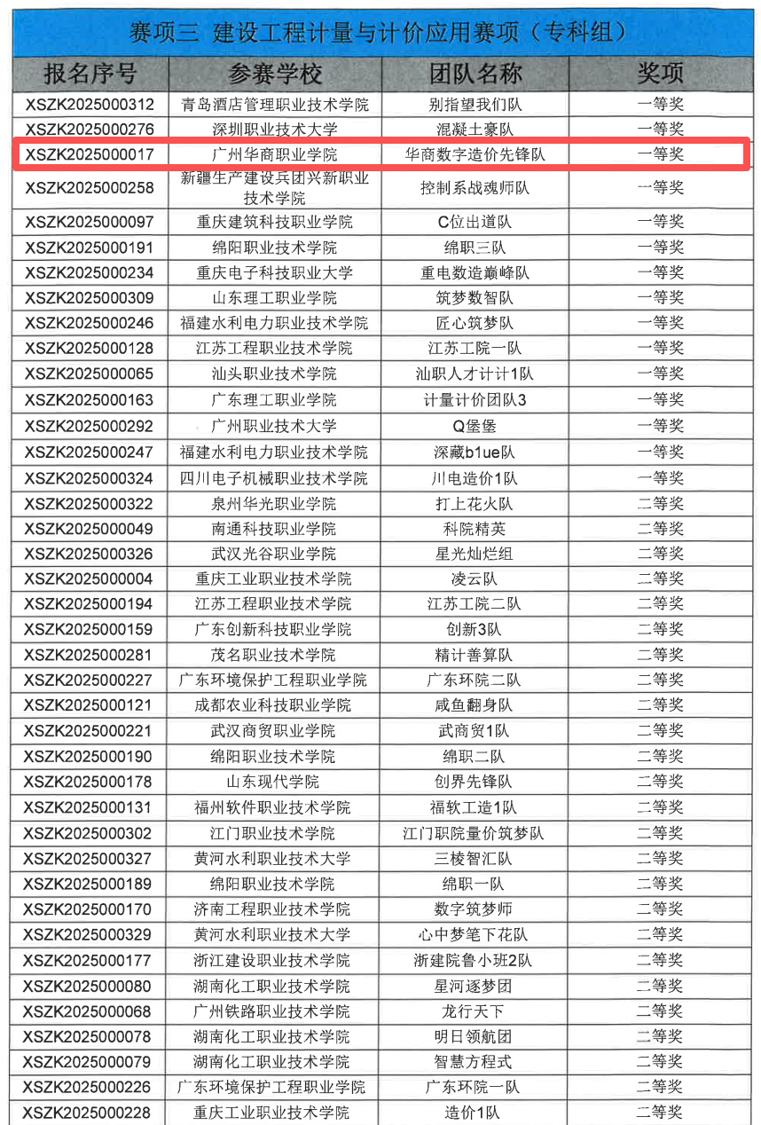在2025年全国数字建筑创新应用大赛“建设工程计量与计价应用赛项”全国总决赛中,由庄卓程、黄宏滨、赖臣杰3名学子组成的“华商数字造价先锋”团队,在严志娟、刘转英两位指导教师的指导下,以全国第三名的优异成绩夺得专科组一等奖,取得突破性成绩,为校争光。
