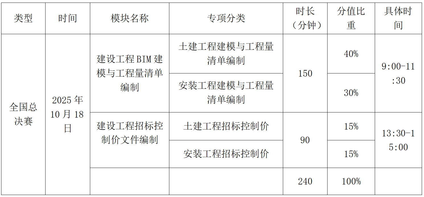 2025年全国数字建筑创新应用大赛“建设工程计量与计价应用赛项”全国总决赛作为赛事最高级别比拼,汇聚了来自全国各省市选拔赛中脱颖而出的晋级队伍,参赛团队均具备扎实的专业能力与丰富的实操经验,竞争尤为激烈。本次总决赛延续“建设工程BIM建模与工程量清单编制”“建设工程招标控制价文件编制”两大核心模块,聚焦土建工程建模与清单编制、安装工程建模与清单编制、土建工程招标控制价、安装工程招标控制价四大专项,赛制延续了选拔赛240分钟的高强度赛程,各专项分值占比分别为40%、30%、15%和15%,考核误差标准与选拔赛保持一致——误差需控制在3%以内方得满分,误差3%—5%区间得分线性分布,误差超过5%则该项不得分。比赛通过“广联达数字考试平台”进行对量评分,对参赛团队的精准度与实操稳定性提出极高要求。