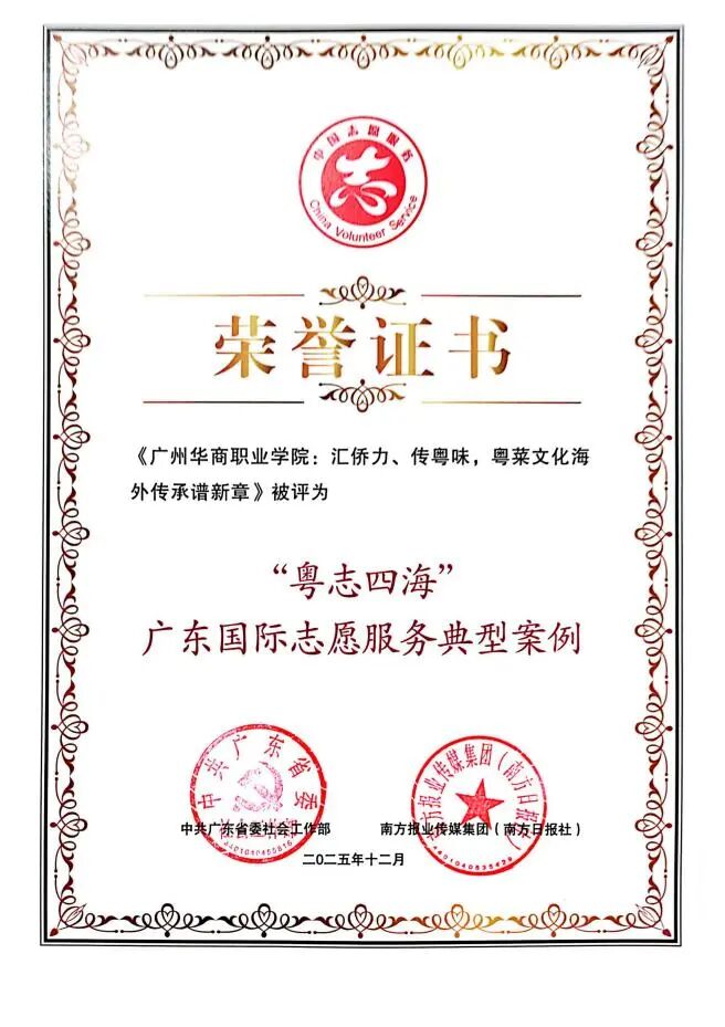 “粤志四海”广东国际志愿服务典型案例征集活动由中共广东省委社会工作部、南方报业传媒集团(南方日报社)联合组织开展,旨在挖掘和推广广东省在国际志愿服务领域的优秀实践与创新模式。此次入选典型案例,标志着我校依托“中餐繁荣基地”开展的国际志愿服务工作获得了省级政府部门的高度认可,其模式与成效具有典型的示范意义。