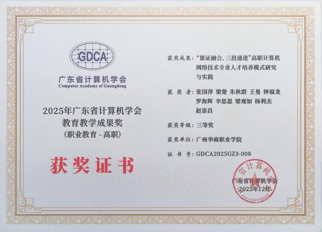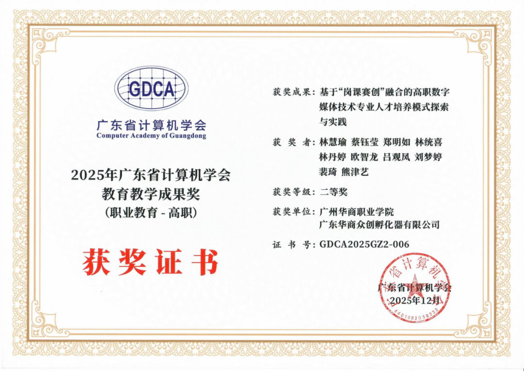 1月10日晚,年会颁奖典礼顺利举行,我校人工智能技术学院申报的三项教学成果项目喜获佳绩,首席顾问龚芳海老师团队《“技术赋能、平台支撑、项目驱动”计算机类专业数字化人才培养的创新与实践》项目荣获一等奖,林慧瑜老师团队《基于“岗课赛创”融合的高职数字媒体技术专业人才培养模式探索与实践》项目荣获二等奖,张国萍老师团队《“课证融合、三段递进”高职计算机网络技术专业人才培养模式研究与实践》项目荣获三等奖,充分彰显了学校在人工智能教育教学改革与创新实践方面的扎实积累与突出成果。