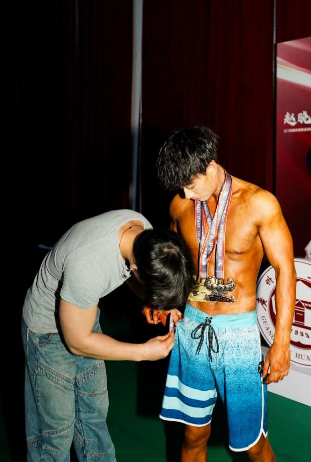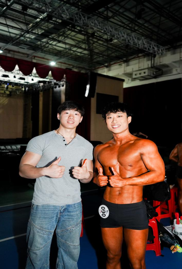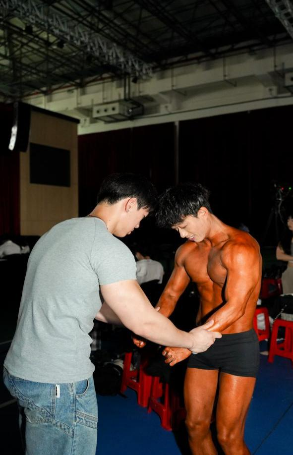 在赛事执行阶段,我校健美队组建专项保障小组提供全流程支持。五名校队成员按标准化备赛流程分工协作:形体呈现组负责参赛者肌肉线条强化与舞台形象塑造;影像记录组全程跟踪拍摄竞技画面;体能激活组则专攻赛前热身方案实施。当“华商加油”的团队口号响彻赛场时,系统化的备赛成果与整齐划一的院校标识形成独特视觉符号,既为选手注入竞技动能,更立体展现了我校“训赛一体”的人才培养机制建设成效。