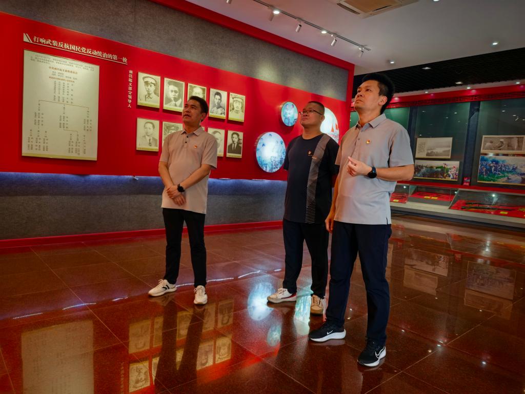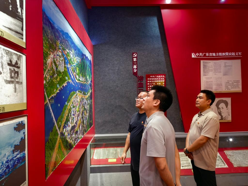 在三河坝纪念馆内,透过珍贵的历史照片、文物和场景复原,支部党员深入了解了三河坝战役的战略意义:1927年南昌起义后,朱德率部在此阻击敌军三天三夜,为革命火种保存了骨干力量。园区内高达3.98米的朱德铜像昂首挺立,生动再现了元帅戎马倥偬的英姿。站在观景长廊远眺,梅江、汀江、梅潭河三江汇流的壮阔景象尽收眼底,党员们深刻感受到革命先烈以山河为证、以热血护信仰的崇高精神,更体会到客家儿女在战火中与红军同舟共济的家国情怀。