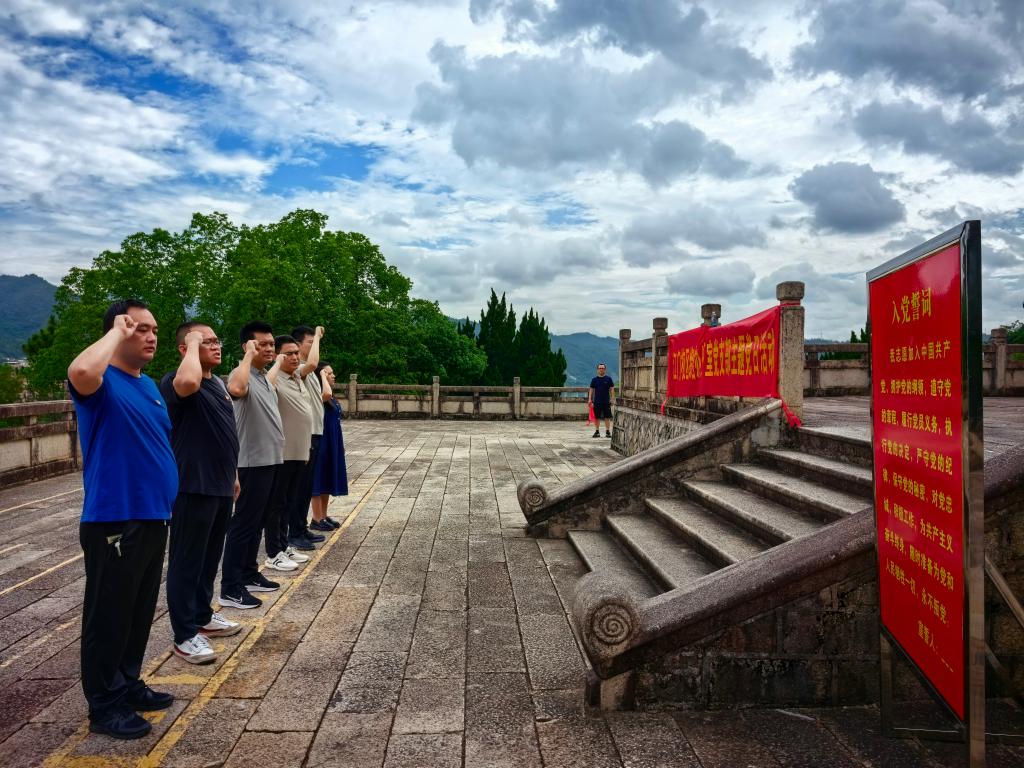 学习的第一站,全体党员、入党积极分子来到“八一”起义军三河坝战役纪念园。纪念园位于梅州市大埔县三河镇八一路,占地总面积18万平方米,由烈士纪念碑、纪念馆、朱德铜像等九大主体部分组成。步入园区,巍然矗立的纪念碑高15米,碑身以365块花岗石砌成,象征着革命先烈用鲜血铸就的永恒丰碑。碑体正面镌刻着朱德元帅亲笔题写的“八一起义军三河坝战役烈士纪念碑”,碑座铭刻着第二十五师师长周士第撰写的碑文,字字铿锵,述说着那段悲壮历史。江门校区党支部党支部书记黄金荣带领全体党员在瞻仰平台上肃立默哀,面对鲜红党旗重温入党誓词,铿锵誓言回荡在青山绿水间。