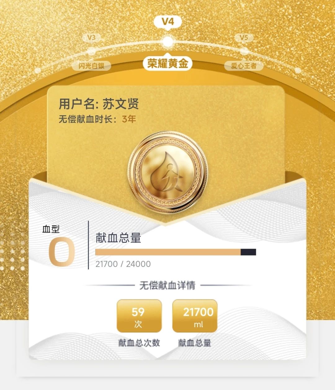在2022年6月15日世界无偿献血日,苏文贤第一次参与无偿献血,登记了造血干细胞捐献、登记人体器官捐献。这一次“三献”成为了他投身志愿服务的起点。自2023年起,苏文贤献血共计59次,献血量累计达到21700毫升。从此,红十字精神中的人道、博爱、奉献精神就深深镌刻在了苏文贤的心中。