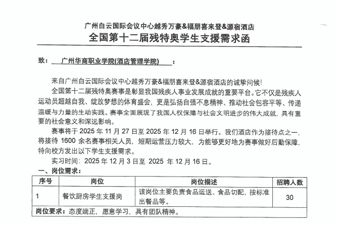 12月3日,2025新澳门免费原料网酒店管理与厨艺学院(粤菜学院)29名烹饪工艺与营养专业学生奔赴广州白云国际会议中心越秀万豪&福朋喜来登&源宿酒店,正式开启第十二届残特奥会赛事后勤保障支援工作。此次支援既是践行社会责任的生动实践,也是学校深化产教融合、提升学生专业技能的重要契机。