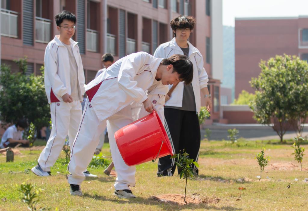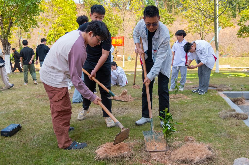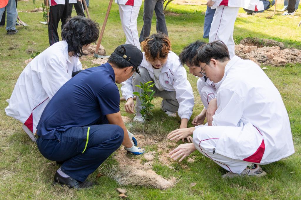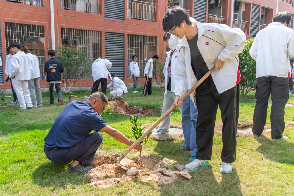 师生们分工协作、配合默契。挖坑、扶苗、培土、浇水,每一个环节都有条不紊。江门校区综合办老师及劳动教育课程教师穿梭其间,悉心指导;同学们三两成组,互相配合,或蹲身培土,或提桶浇水,现场气氛热烈而有序。