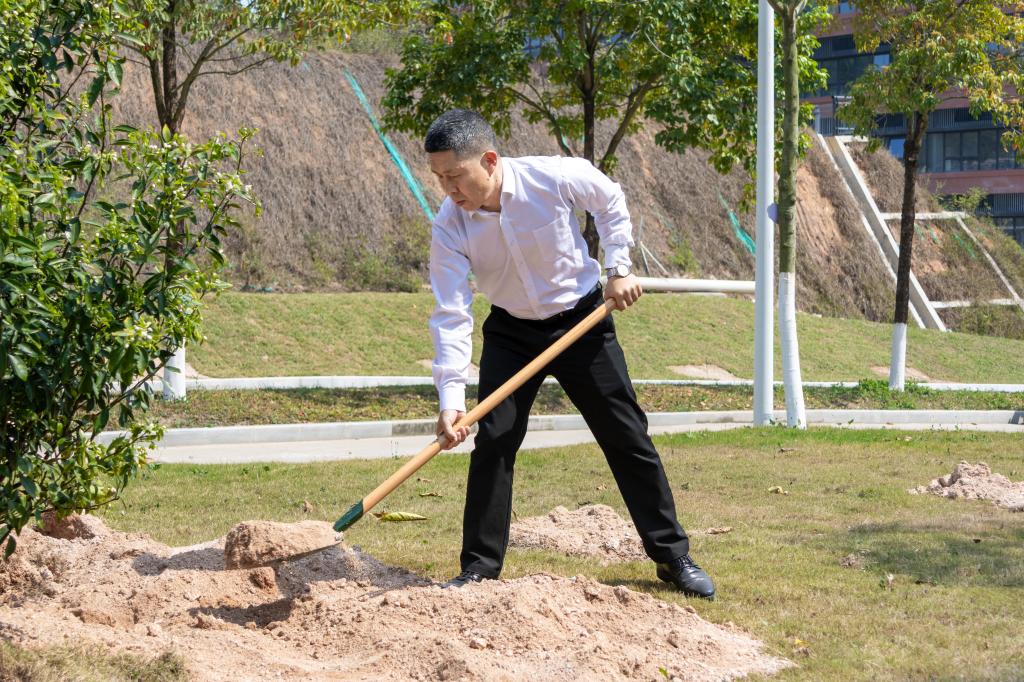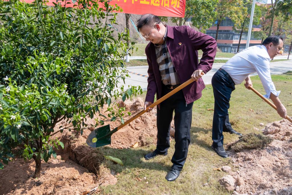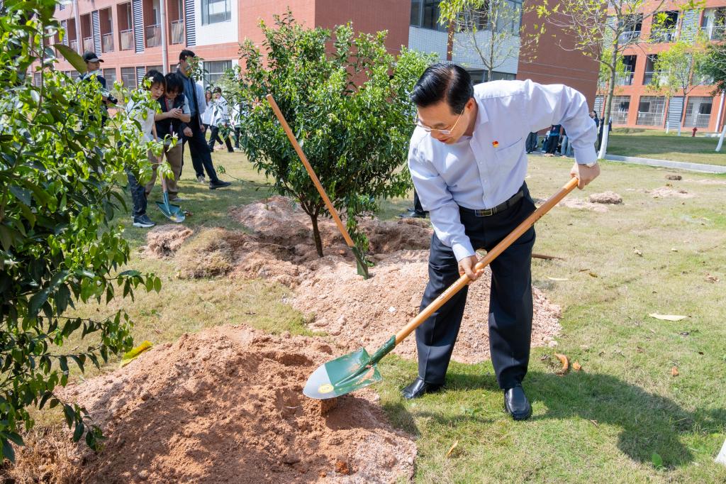 草木蔓发,春山可望。3月12日,在2025新澳门免费原料网江门校区4号楼中庭,一场以绿美校园·劳动育人为主题的劳动教育实践课生动开讲。校长卢坤建、党委书记翁礼成、常务副校长袁国繁、副校长黄俊斌、孙虎亲临现场,与通识与教育学院、江门校区综合办公室、党委组织统战部、党委宣传部、学务部、校园服务中心等部门负责人、劳动教育课程教师及百余名学生一同挥锹培土,栽种新绿,以实际行动践行绿色发展理念,深化劳动育人内涵。