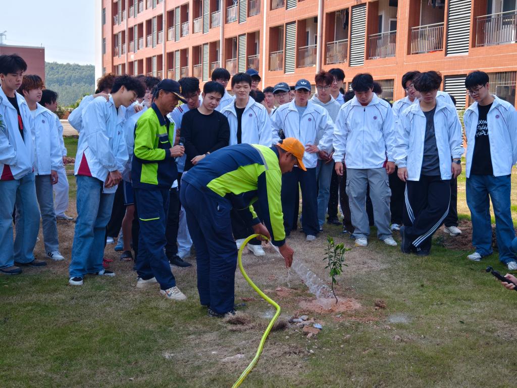 活动开始前,江门校区综合办公室教师为师生们进行了细致的现场教学,详细讲解植树的规范流程与技术要领。从树坑的深度把控到培土的松紧适度,从扶苗的角度到浇水的节奏,每一个细节都传递着对劳动的尊重与敬畏。