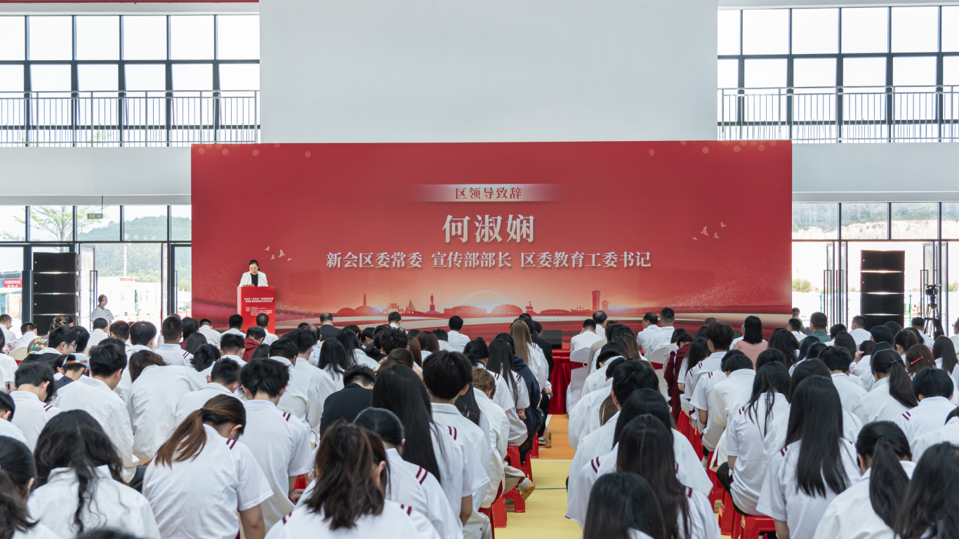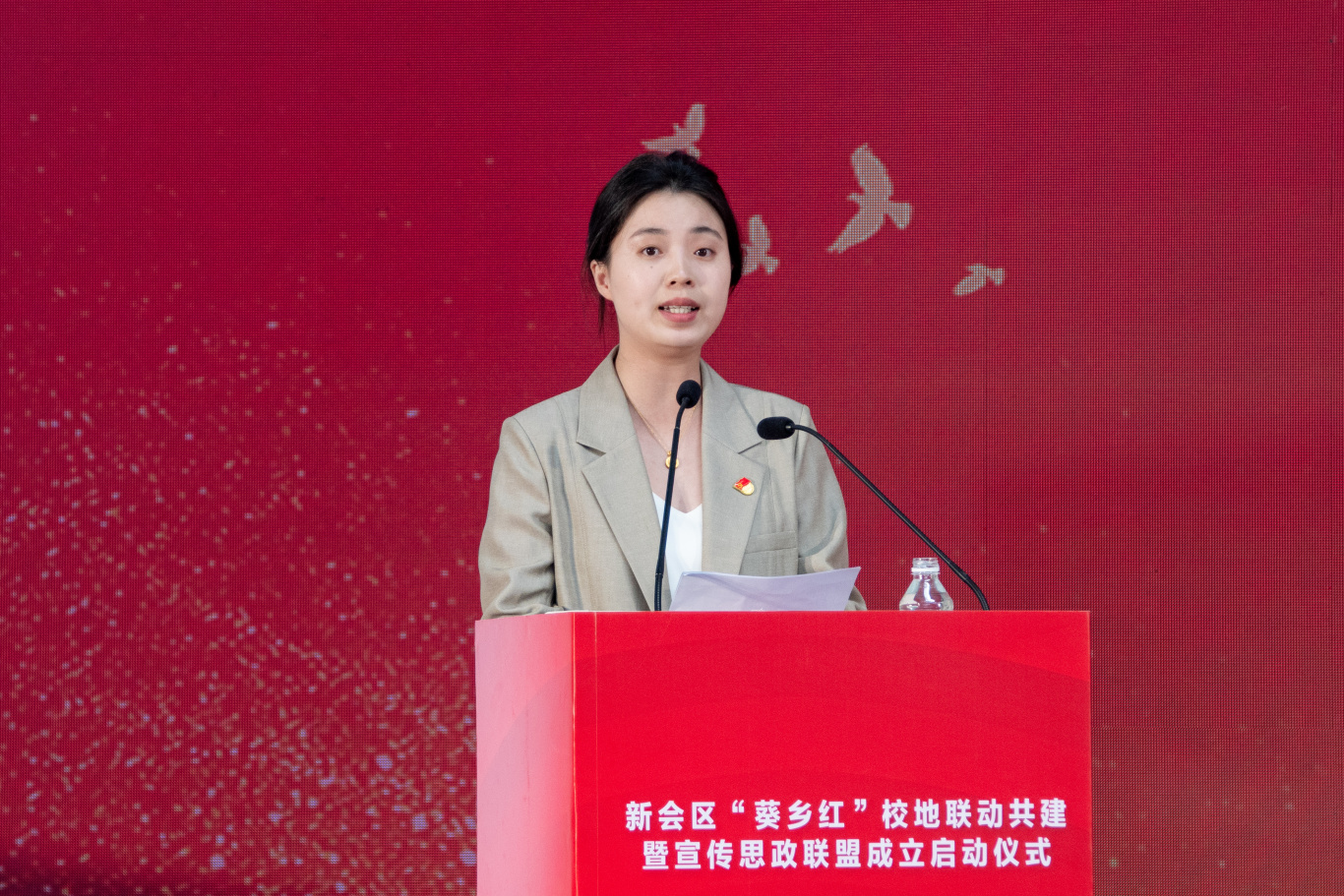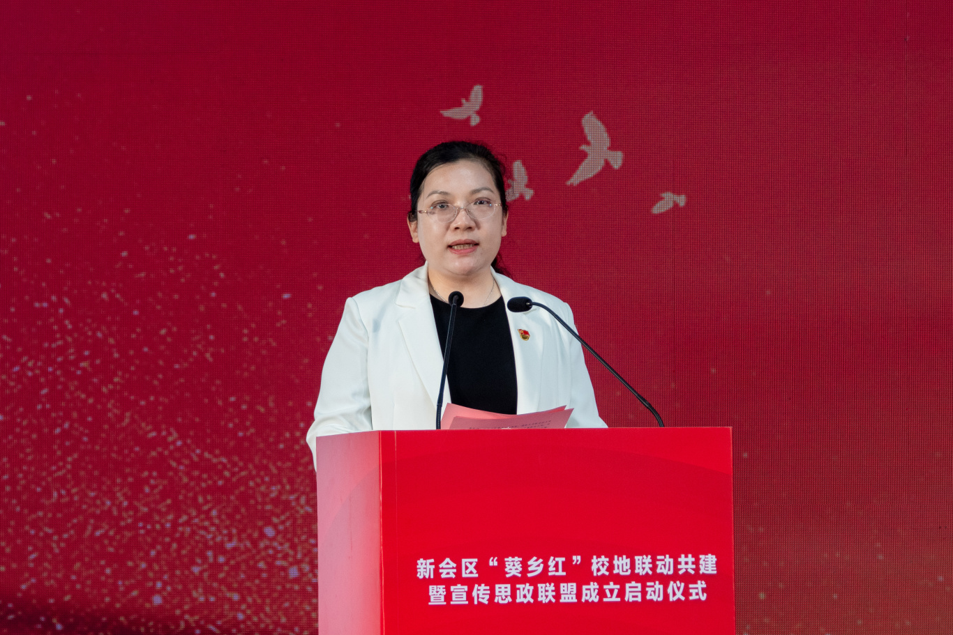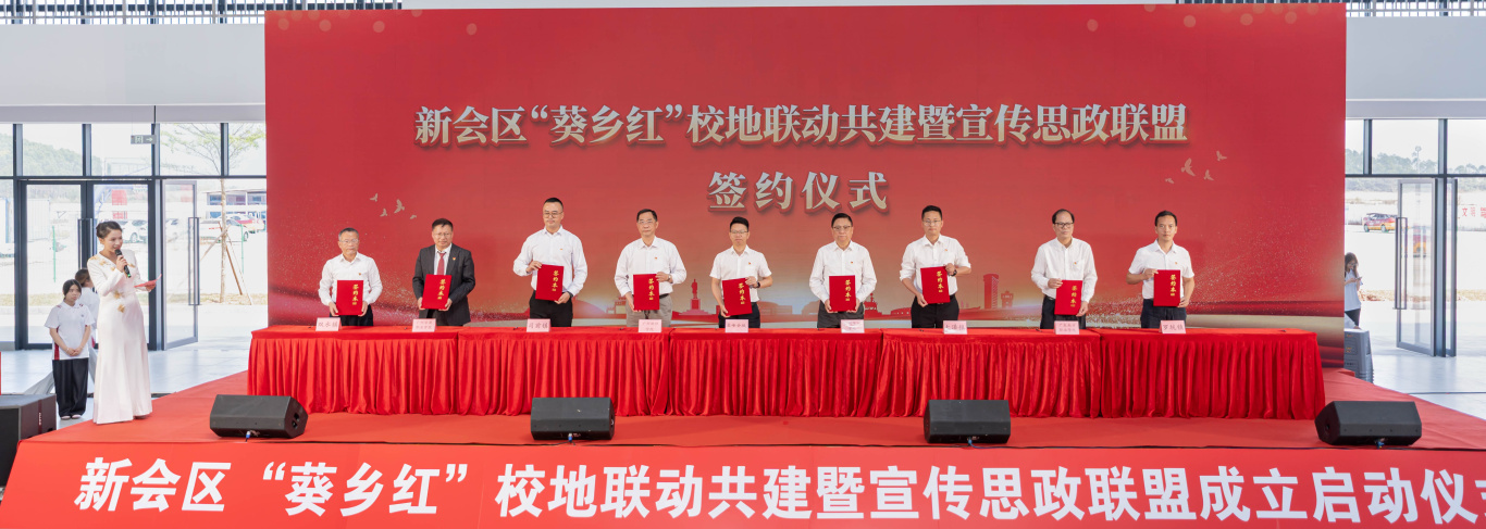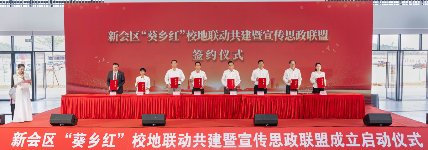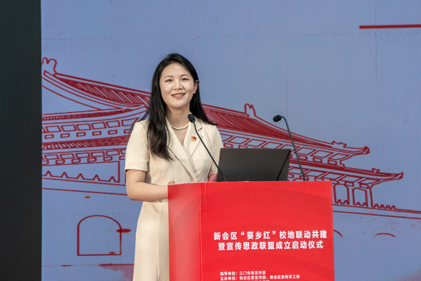 他强调,推进新会区“葵乡红”校地联动共建、构建校地宣传思政联盟是落实教育强国战略、办人民满意教育的战略举措,旨在搭建理论共学、资源共享、活动共举、成果共享的协同育人平台,推动大中小学思政一体化建设,让思政教育走出校园、扎根基层,让红色基因、侨乡精神在葵乡大地代代相传。他寄语青年学子用脚步丈量江门大地,用眼睛发现侨乡精神,用耳朵倾听人民呼声,用内心感应时代脉搏,成长为扎根湾区、服务中国式现代化建设的时代新人,让“红色思政之花”在葵乡大地绚丽绽放。