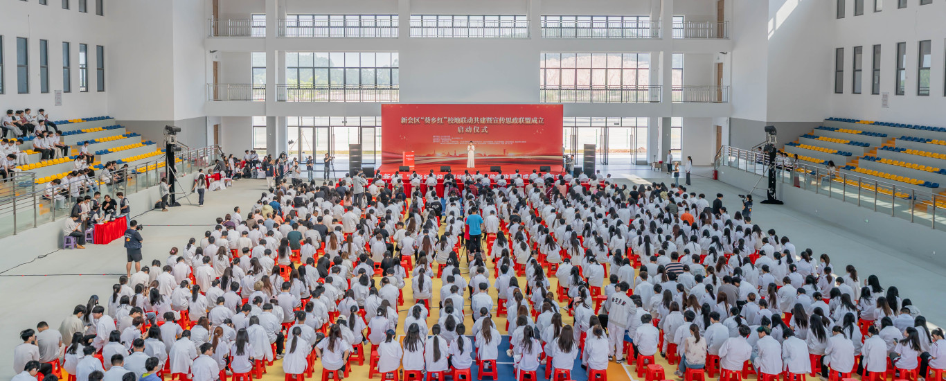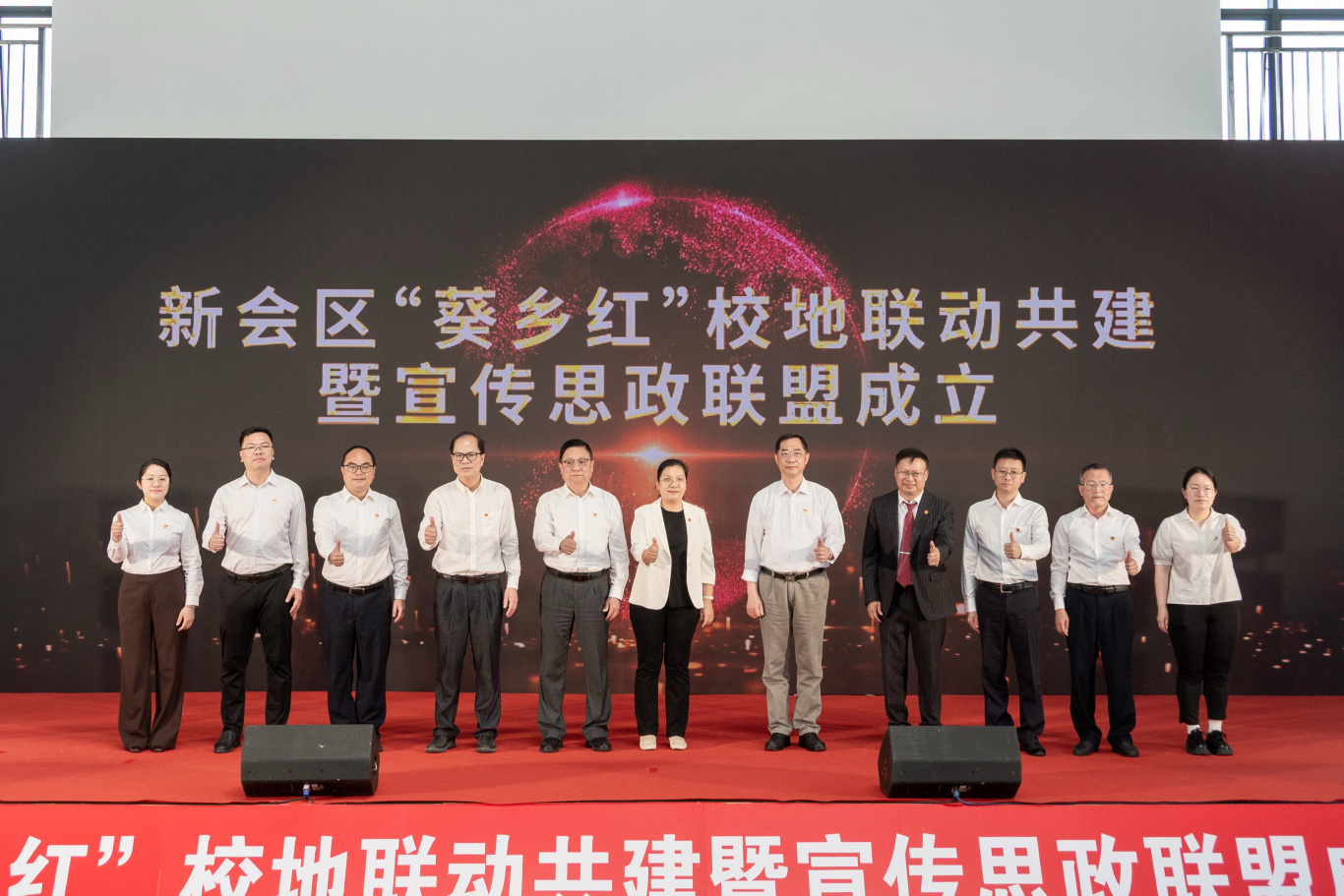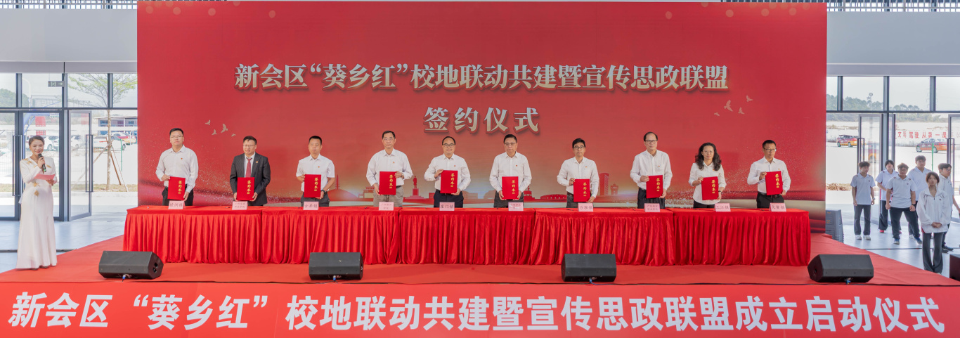 为深入学习贯彻习近平新时代中国特色社会主义思想,全面落实党的二十大和二十届历次全会精神,充分发挥宣传思想政治工作“传家宝”和“生命线”作用,深化校地协同育人机制,激活新会“葵乡”文化资源,推动高校与地方宣传思政工作深度融合,3月19日上午,新会区委宣传部携同属地四所民办高校党委,2025新澳门免费原料网江门校区体育馆举行“葵乡红”校地联动共建暨宣传思政联盟成立启动仪式。活动采取“主会场+线上分会场”双线联动形式,覆盖新会区四所民办高校及属地中小学,十万师生通过云端同步参与。