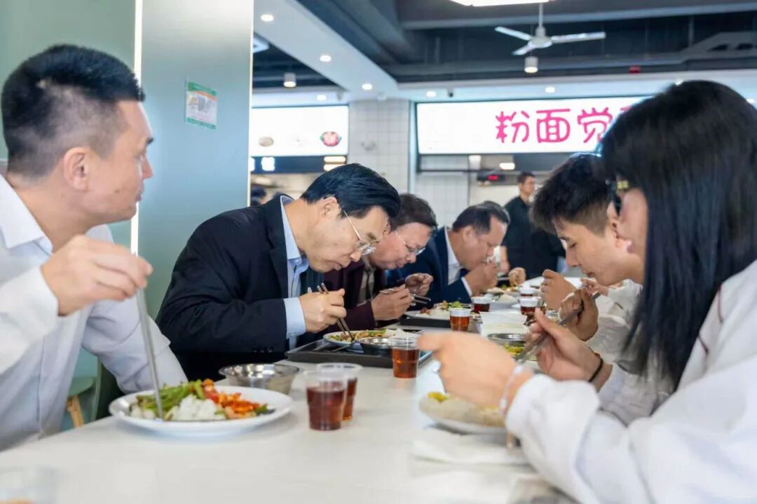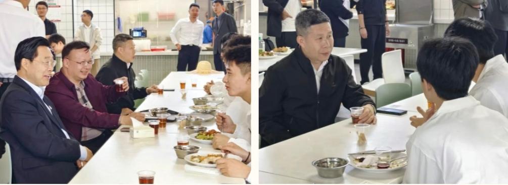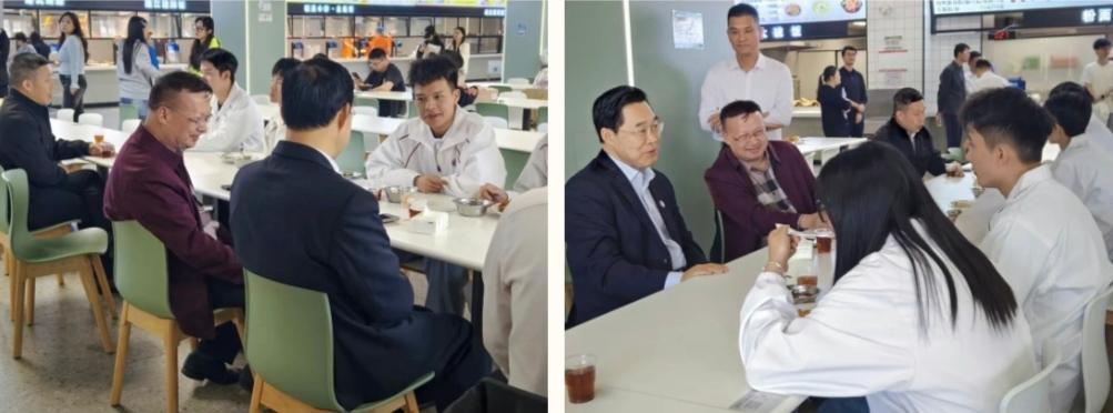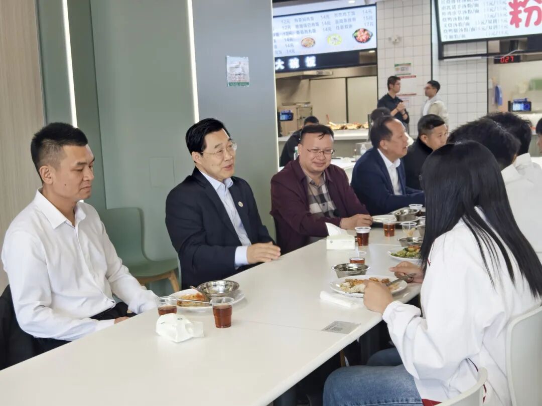 “食堂的饭菜价格贵不贵?”“口味还习惯吗?”“对食堂服务有什么建议?”在校领导陪餐环节,校领导们与学生围坐一堂,共同用餐,他们认真倾听每位同学的真诚反馈。同学们围绕食堂的餐品搭配、口味咸淡、服务态度等方面提出具体建议。此外,校领导们还详细询问同学们在校学习、生活的情况,并耐心解答同学们的各项疑问,勉励同学们不负韶华,奋力拼搏。