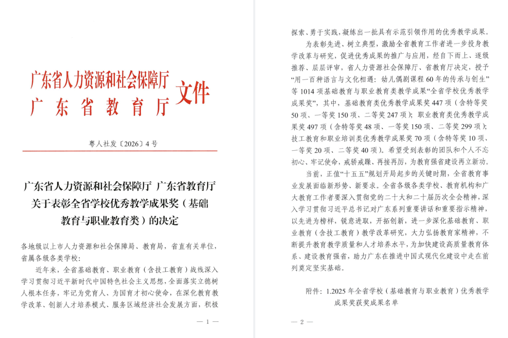 2025年广东省(职业教育)优秀教学成果奖(高职)学校获一等奖1项、二等奖1项