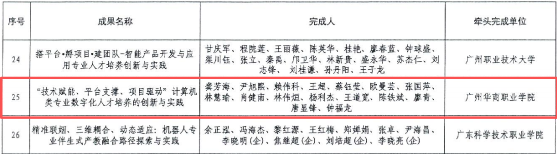 《“技术赋能、平台支撑、项目驱动”计算机类专业数字化人才培养的创新与实践》项目获评省级教学成果奖二等奖。该项目由我校携手广州鹏科网络技术有限公司、广州市昊轩信息科技有限公司等企业开展,通过数字技术赋能,以平台支撑搭建实践载体,用项目驱动激活学习动力,形成了计算机类专业数字化人才培养的创新模式,有效提升了学生的数字技能与岗位适配能力,为区域数字产业发展提供了人才支撑。