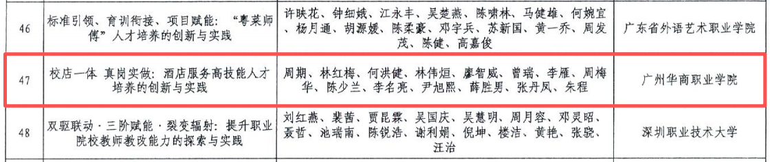 《校店一体,真岗实做:酒店服务高技能人才培养的创新与实践》项目获评省级优秀教学成果奖一等奖。该项目由我校联合广州太阳城大酒店、广东轻工职业技术大学、万豪国际集团等校企单位联合开展,聚焦“校店一体、真岗实做”酒店服务高技能人才培养改革,旨在打破课堂与岗位的壁垒,以“真岗实做”为核心构建酒店服务人才培养体系,将企业真实工作场景、岗位标准融入教学全过程,为酒店行业输送兼具实操能力与职业素养的高技能人才。