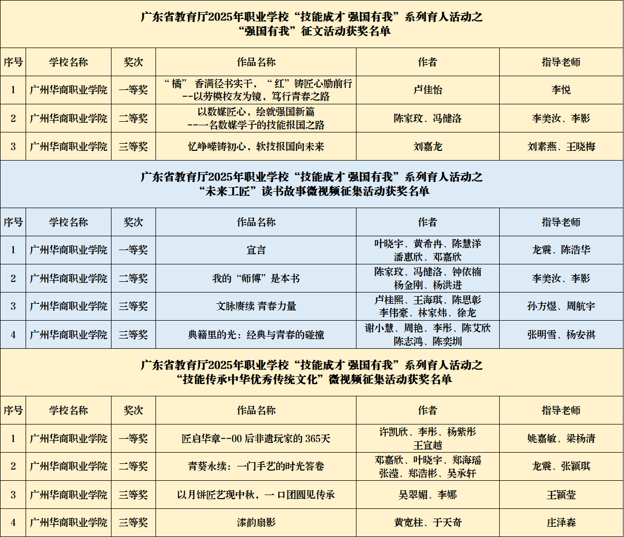 “未来工匠”读书故事微视频征集活动中,《宣言》获一等奖,《我的“师傅”是本书》获二等奖,《文脉赓续 青春力量》《典籍里的光:经典与青春的碰撞》获三等奖。