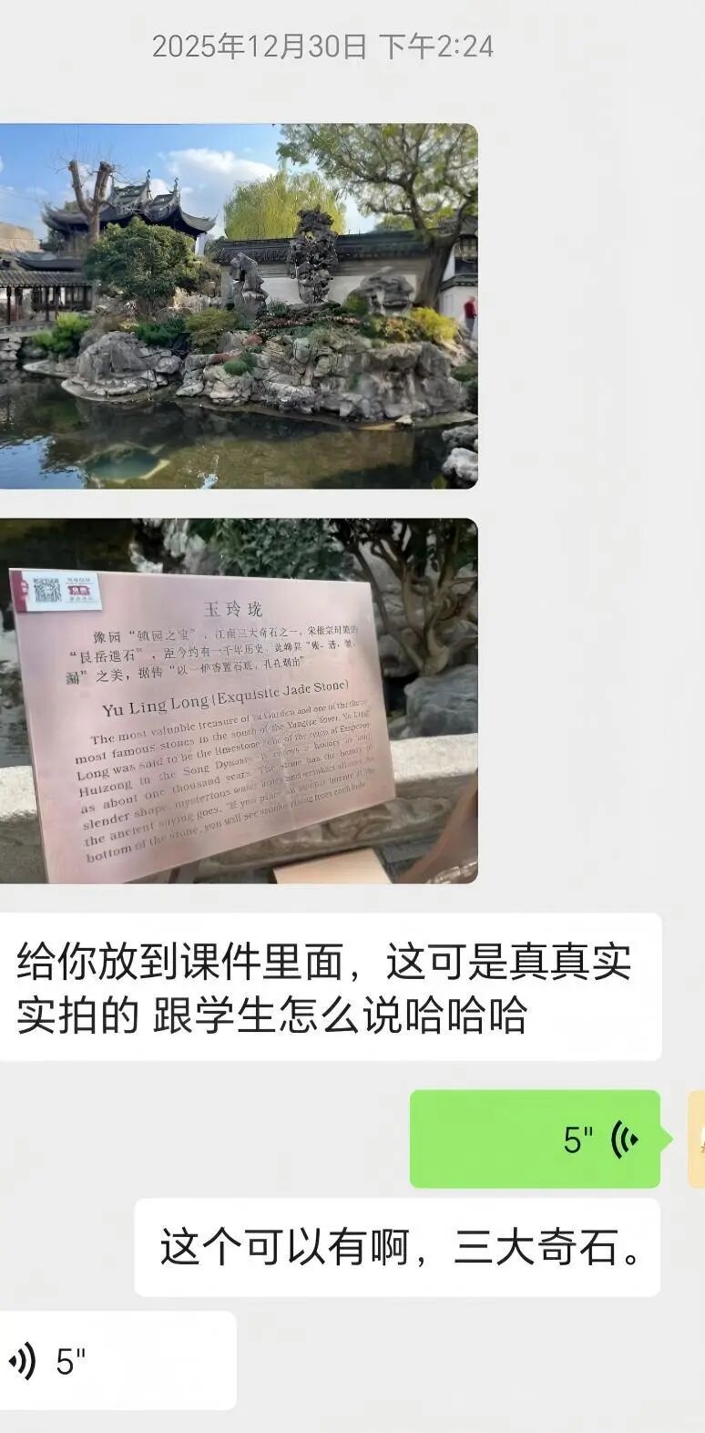 而印证有时就藏在不经意的细节里。一位目前正在实习的学生,到上海豫园旅游特意给她发来一张太湖石的照片,留言说:“老师,您讲太湖石‘皱、漏、瘦、透’的特性,我眼前这块就是活教材,以后上课可以用咱们自己拍的图了。”学生的反馈让周期意识到,课程知识已经内化为学生的审美素养,而这份主动分享,更是一种职业使命感的萌芽,她觉得这比任何直接的赞美都更有分量。