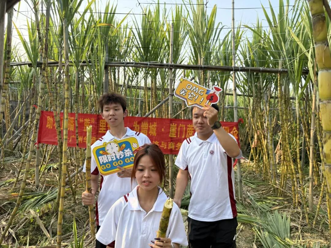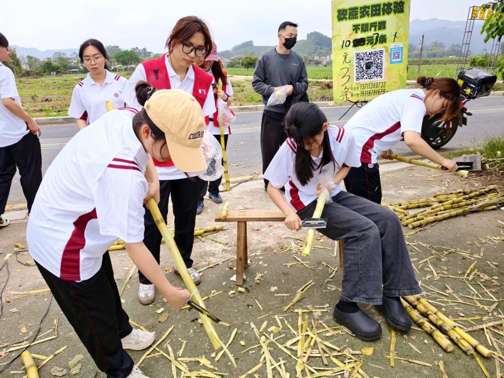 同日,人工智能技术学院“同心燃梦、数字赋能”乡村振兴促进队奔赴增城能记家庭农场。面对甘蔗滞销困境,学子们扎根蔗田现场砍蔗、实景展示,用真诚讲解传递蔗农心声,以“以购代捐、以买代帮”的实际行动,为滞销甘蔗打通销路,让田间清甜直达千家万户。